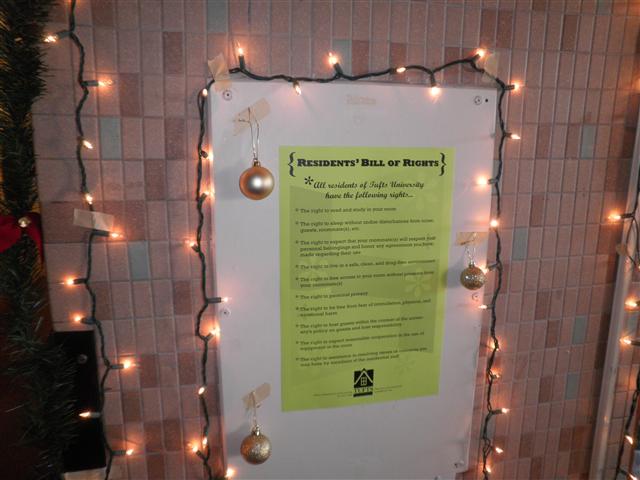 It was around two-something in the morning when I finally put down the laptop, grabbed my toothbrush and ID card, and headed down the hall toward one of Tilton's bathrooms. But I hadn't even gotten past my door before I saw it. There it was, being constructed right in front of me. Like elves, residents were busy working late into the night, untangling, taping, and getting ready for the holidays. Here is what they produced: